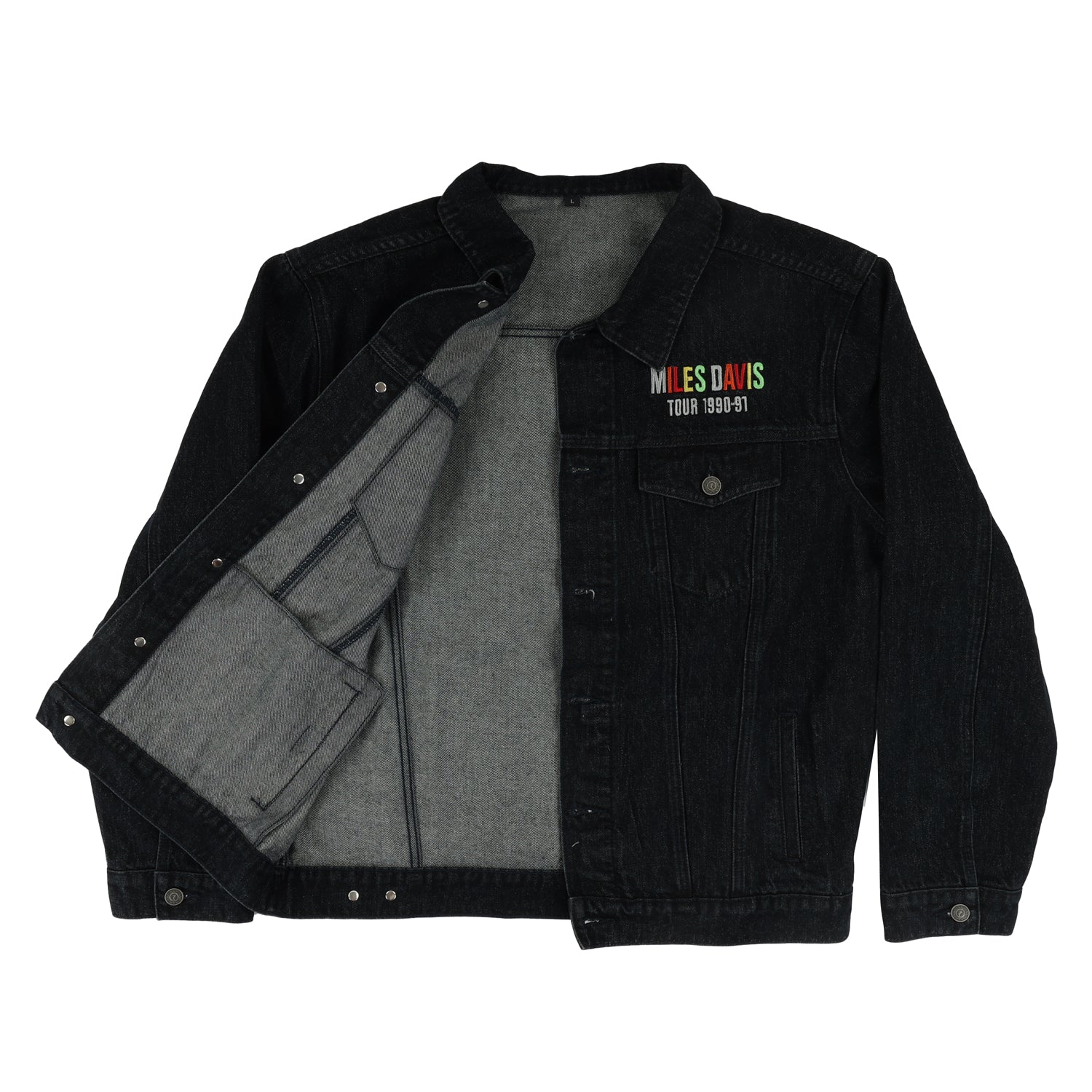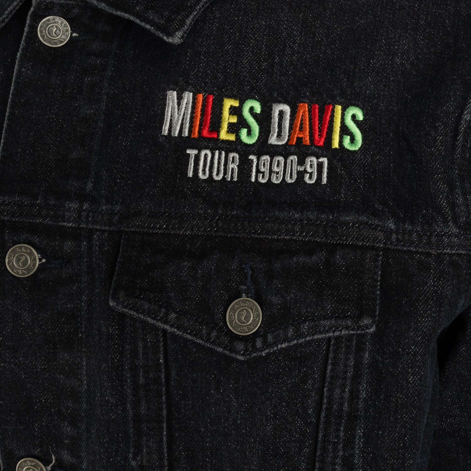 Step back in time with this vintage inspired Miles Davis 1990 World Tour Denim Jacket. Made from dark indigo denim, it features custom Miles Davis branded metal buttons, clean front embroidery, and a bold full-color back print with original artwork created by Miles himself.